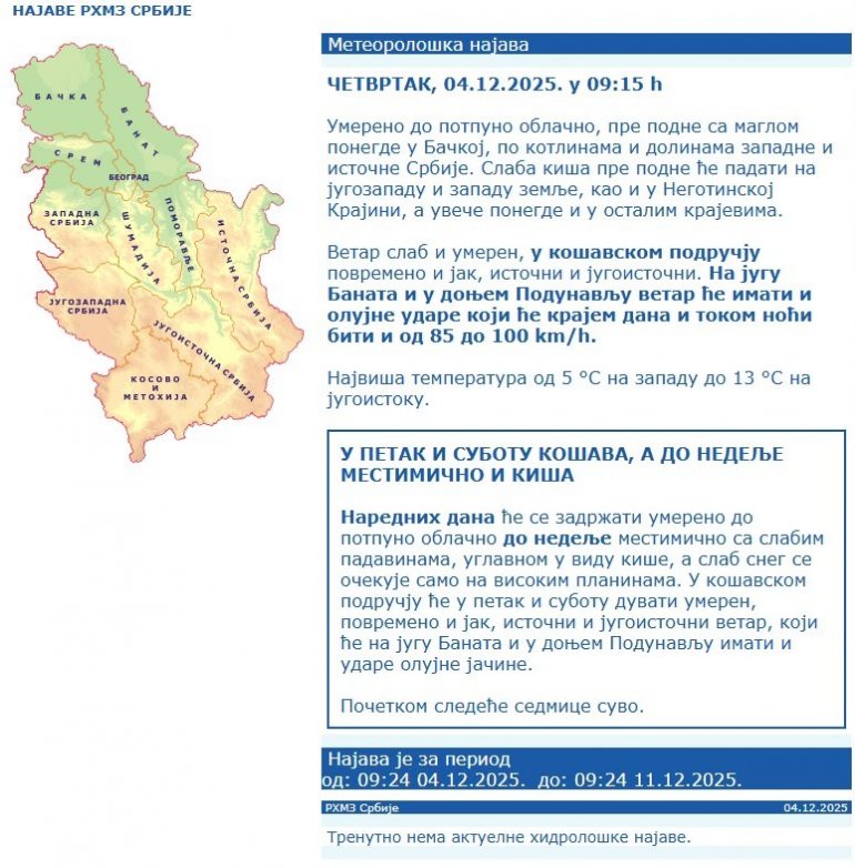 REPUBLIČKI hidrometeorološki zavod (RHMZ) objavio je detaljnu prognozu za četvrtak, 4. decembar 2025. godine, najavljujući nestabilno vreme koje će obeležiti magla, kiša, ali pre svega, izrazito jaki udari vetra, naročito u pojedinim delovima zemlje.