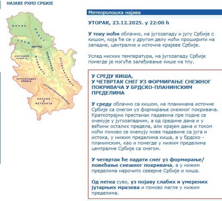 U sredu oblačno sa kišom, na planinama istočne Srbije sa snegom uz formiranje snežnog pokrivača. Kratkotrajni prestanak padavina pre podne se očekuje u jugozapadnim, a od sredine dana i u većini ostalih predela, ali krajem dana i tokom noći ponovo se očekuju nove padavine sa juga i istoka, u nižim predelima kiša, a u brdsko - planinskim, kao i ponegde u nižim predelima centralne Srbije sa snegom.