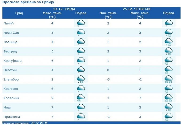 Kratkotrajni prestanak padavina očekuje se pre podne u južnim, a posle podne postepeno i u većini ostalih predela. U košavskom području će duvati umeren i jak, na jugu Banata, u Podunavlju i Pomoravlju i olujni, a u ostalim krajevima slab do umeren istočni i jugoistočni vetar. Najviša temperatura od 4 do 9 °S, prema najavama Republičkog hidrometeorološkog zavoda (RHMZ).