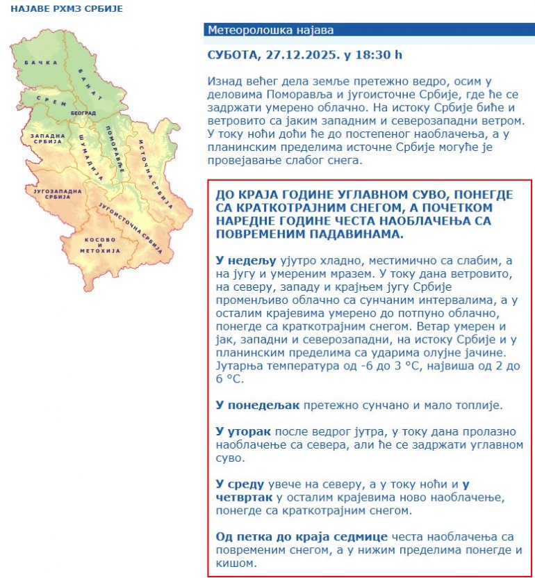 - Iznad većeg dela zemlje pretežno vedro, osim u delovima Pomoravlja i jugoistočne Srbije, gde će se zadržati umereno oblačno. Na istoku Srbije biće i vetrovito sa jakim zapadnim i severozapadni vetrom. U toku noći doći će do postepenog naoblačenja, a u planinskim predelima istočne Srbije moguće je provejavanje slabog snega.