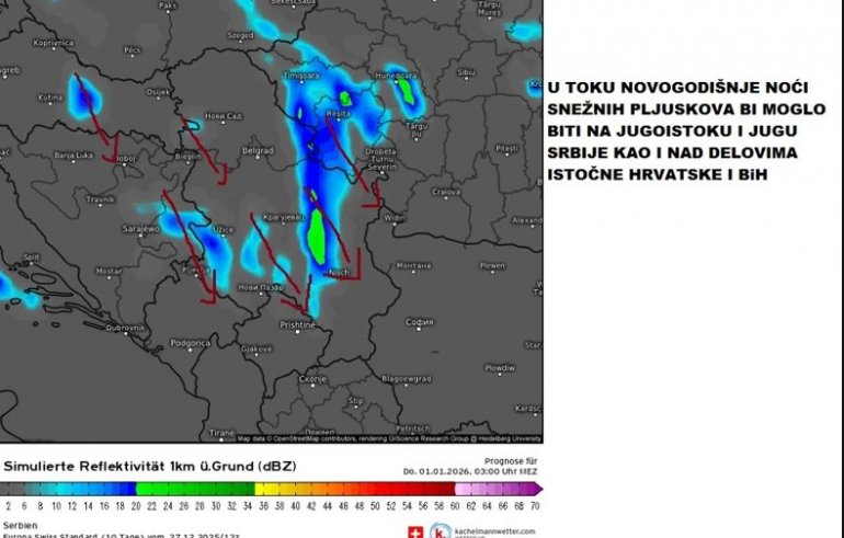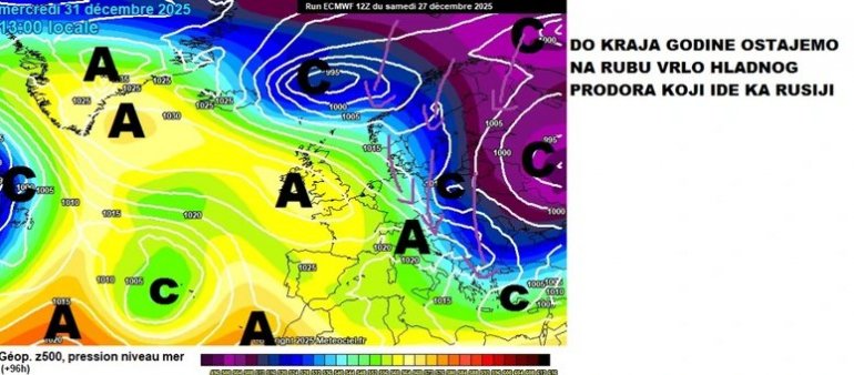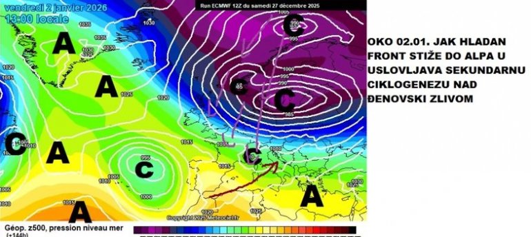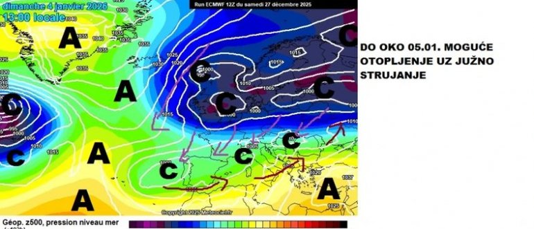 - Početkom godine uglavnom suvo i hladno uz umeren jutarnji mraz, dok bi oko 03.01. do Alpa stigao jak hladni front ciklona nad Skandinavijom i uslovio razvijanje Đenovskog ciklona. Taj ciklon bi prvo ka nama iz Mediterana uz južno strujanja povukao topliji vazduh te bi maksimumi oko 05.01. mogli ići i na oko +10 stepeni Celzijusa - navodi Čubrilo.