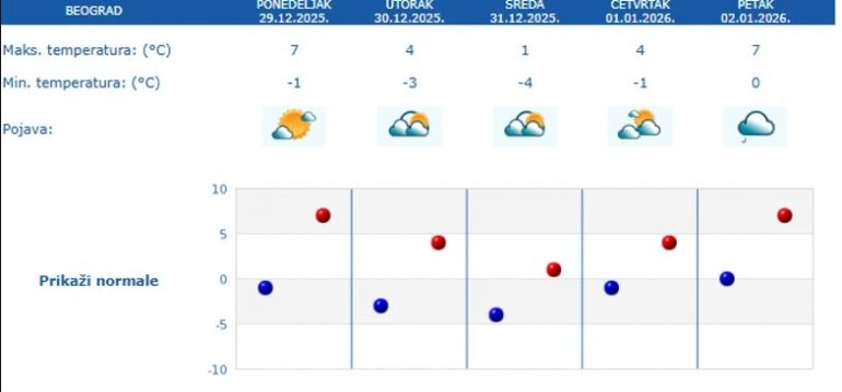 Kako dodaje, najveća verovatnoća za snežne pljuskove se očekuje 31.12. posebno na istoku regiona, duvaće povremeno jak severozapadni vetar. Minimumi od -7 do -1 stepen Celzijusa, a maksimumi od 0 do +5 stepeni Celzijusa.