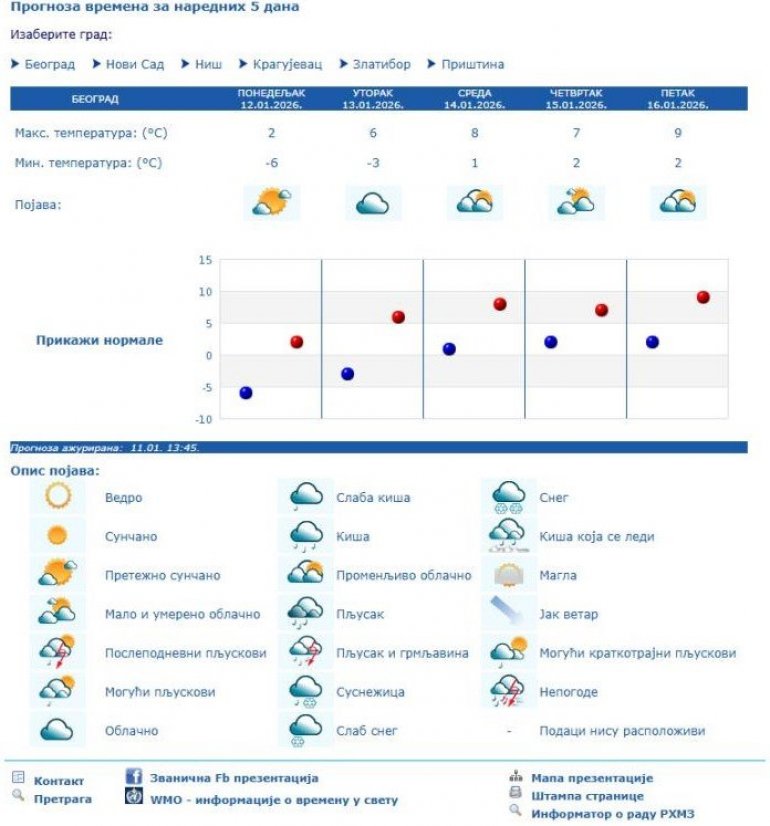 - U ponedeljak jutro veoma hladno sa umerenim i jakim mrazem. Iznad većeg dela pretežno vedro, na istoku i jugoistoku umereno do potpuno oblačno, ponegde uz provejavanje slabog snega, a u toku dana postepeno razvedravanje. Vetar slab i umeren, na istoku povremeno i jak, zapadni i severozapadni, posle podne i uveče u skretanju na slab jugoistočni. Najniža temperatura od -13 °C na severu do -4 °C na istoku Srbije, po pojedinim kotlinama oko -15 °C, a najviša od -4 do 3 °C. - stoji u najavi.