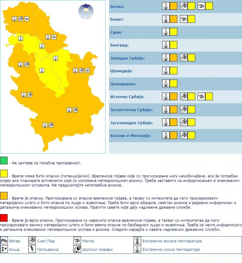 Padavine će biti slabe, sporadične i lokalne, na granici kiše i snega, ali se u oblasti padavina, naročito u večernjim, noćnim i jutarnjim satima, savetuje oprez zbog poledice.