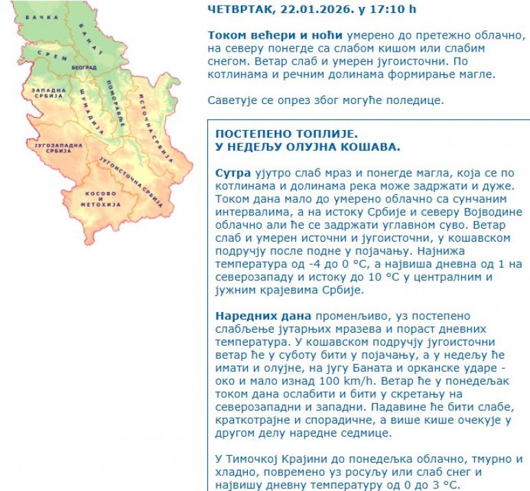 Sutra ujutro slab mraz i ponegde magla, koja se po kotlinama i dolinama reka može zadržati i duže. Tokom dana malo do umereno oblačno sa sunčanim intervalima, a na istoku Srbije i severu Vojvodine oblačno ali će se zadržati uglavnom suvo. Vetar slab i umeren istočni i jugoistočni, u košavskom području posle podne u pojačanju. Najniža temperatura od -4 do 0 °S, a najviša dnevna od 1 na severozapadu i istoku do 10 °S u centralnim i južnim krajevima Srbije.