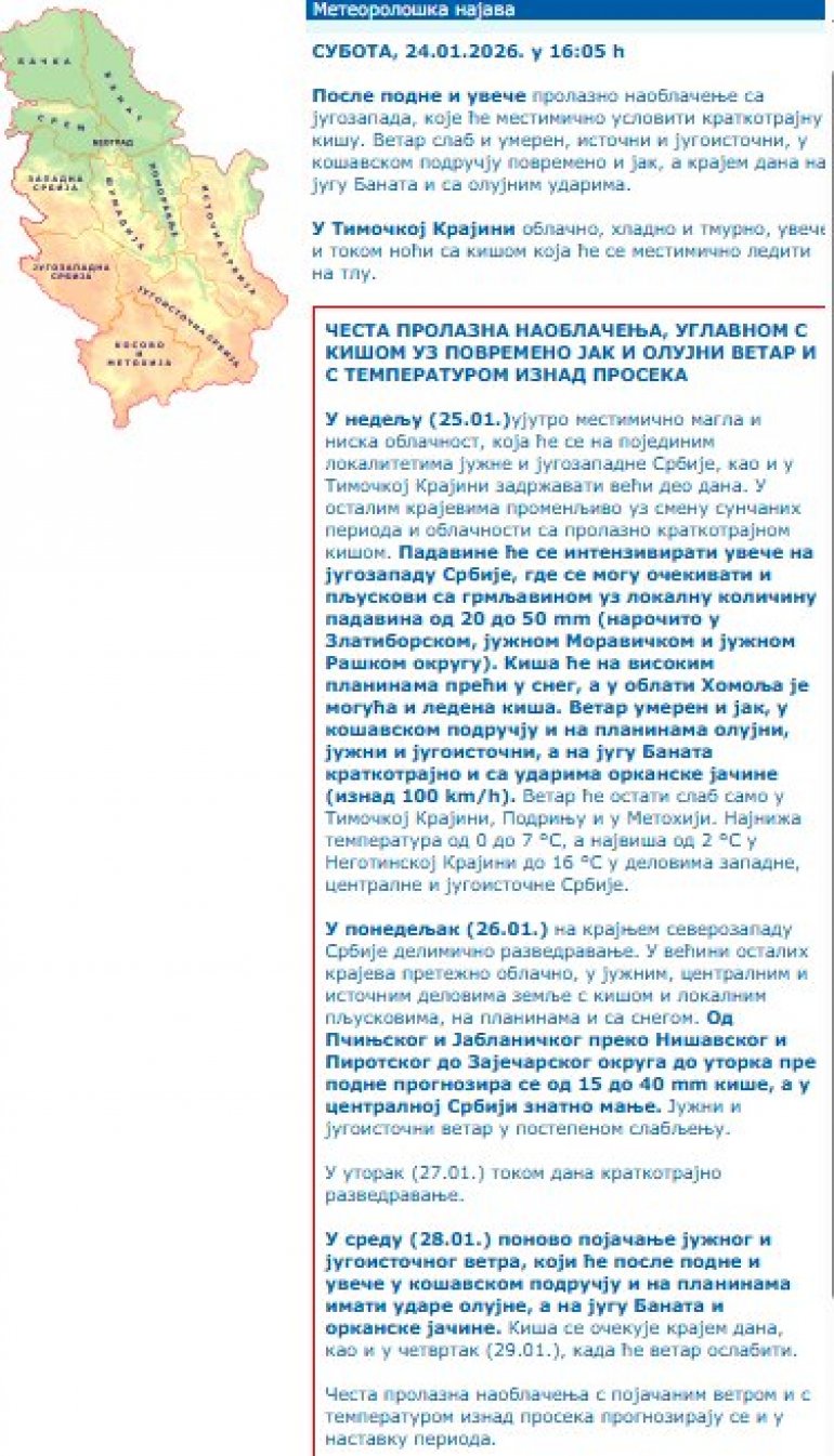 U nedelju (25.01.)ujutro mestimično magla i niska oblačnost, koja će se na pojedinim lokalitetima južne i jugozapadne Srbije, kao i u Timočkoj Krajini zadržavati veći deo dana. U ostalim krajevima promenljivo uz smenu sunčanih perioda i oblačnosti sa prolazno kratkotrajnom kišom. Padavine će se intenzivirati uveče na jugozapadu Srbije, gde se mogu očekivati i pljuskovi sa grmljavinom uz lokalnu količinu padavina od 20 do 50 mm (naročito u Zlatiborskom, južnom Moravičkom i južnom Raškom okrugu). Kiša će na visokim planinama preći u sneg, a u oblati Homolja je moguća i ledena kiša. Vetar umeren i jak, u košavskom području i na planinama olujni, južni i jugoistočni, a na jugu Banata kratkotrajno i sa udarima orkanske jačine (iznad 100 km/h). Vetar će ostati slab samo u Timočkoj Krajini, Podrinju i u Metohiji. Najniža temperatura od 0 do 7 °S, a najviša od 2 °S u Negotinskoj Krajini do 16 °S u delovima zapadne, centralne i jugoistočne Srbije.