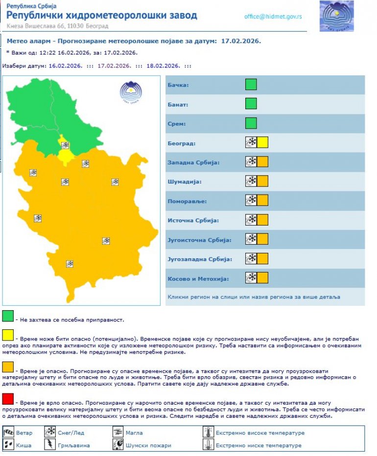 U brdsko-planinskim predelima tokom celog dana padaće sneg, u nižim predelima ujutro se očekuju kiša i susnežica koja će tokom prepodneva u zapadnim, centralnim i istočnim, a posle podne i u južnim predelima, preći u sneg. Na severu zemlje očekuju se mešovite padavine - i kiša i susnežica i sneg, a suvo vreme očekuje se samo na severu Vojvodine. Vetar će biti slab i umeren, sredinom dana i jak, severni i severozapadni, dok će se jutarnja temperatura kretati od 1 do 6 stepeni, najviša dnevna od 0 do 3 stepena, na severu od 4 do 6 stepeni.
