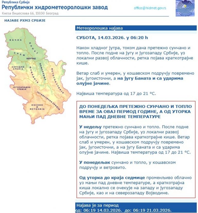Kako RHMZ navodi, nakon hladnog jutra, tokom dana biće pretežno sunčano i toplo. Posle podne na jugu i jugozapadu Srbije, uz lokalni razvoj oblačnosti, moguća je retka pojava kratkotrajne kiše.