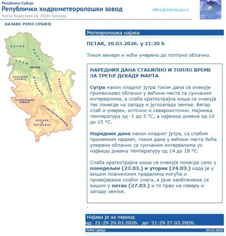 Najniža temperatura od -1 do 5 stepni, a najviša dnevna od 10 do 15. Narednih dana nakon hladnog jutra, sa slabim prizemnim mrazem, tokom dana u većini mesta biće umereno oblačno sa sunčanim intervalima uz najvišu dnevnu temperaturu od 14 do 18 stepeni.