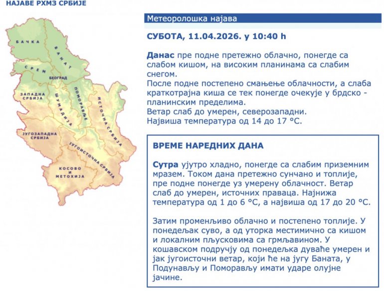 Zatim promenljivo oblačno i postepeno toplije. U ponedeljak suvo, a od utorka mestimično sa kišom i lokalnim pljuskovima sa grmljavinom. U košavskom području od ponedeljka duvaće umeren i jak jugoistočni vetar, koji će na jugu Banata, u Podunavlju i Pomoravlju imati udare olujne jačine.