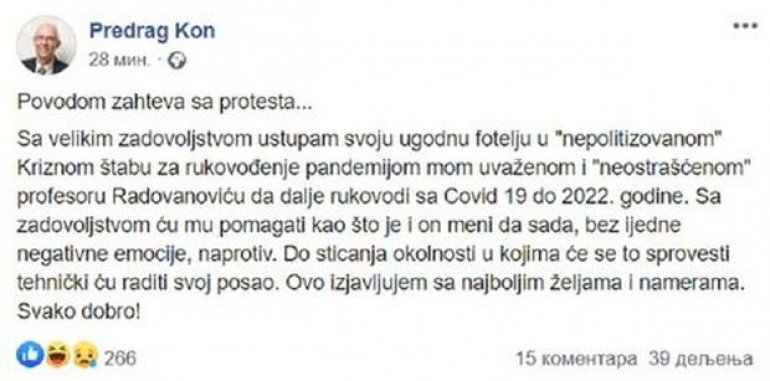 - Povodom zahteva sa protesta... Sa velikim zadovoljstvom ustupam svoju ugodnu fotelju u "nepolitizovanom" Kriznom štabu za rukovođenje pandemijom mom uvaženom i "neostrašćenom" profesoru Radovanoviću da dalje rukovodi sa Covid 19 do 2022. godine. Sa zadovoljstvom ću mu pomagati kao što je i on meni sada, bez ijedne negativne emocije, naprotiv. Do sticanja okolnosti u kojima će se to sprovesti tehnički ću raditi svoj posao. Ovo izjavljujem sa najboljim željama i namerama. Svako dobro!