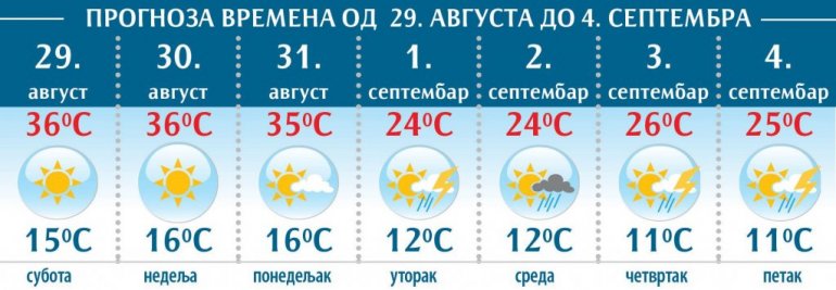 TRI dana tropskih vrućina sa najvišim dnevnim temperaturama iznad 35 stepeni, a od utorka osetno zahlađenje sa češćim pljuskovima praćenim grmljavinom, izgledi su vremena za narednih sedam dana.