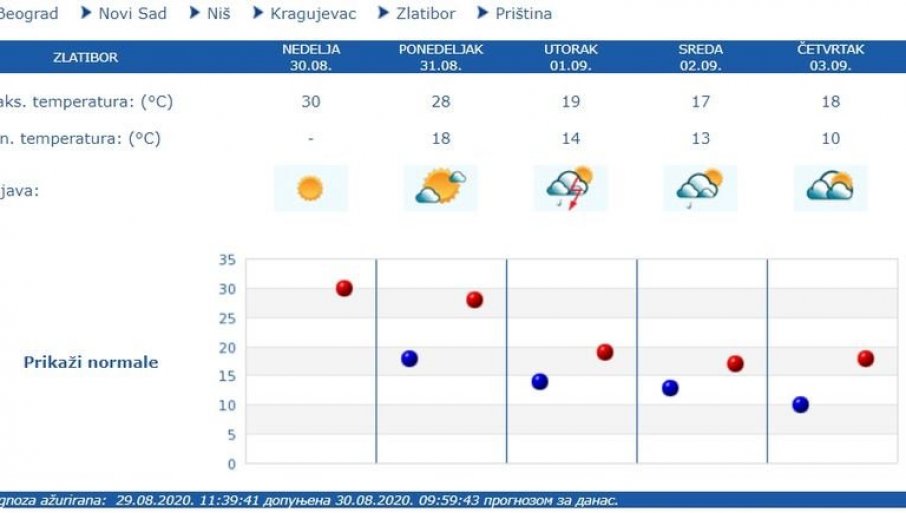 Prema navodima sa sajta RHMZ-a za narednih pet dana, temperatura bi se u Beogradu sa današnjih 36 mogla spustiti na 24, koliko se očekuje u četvrtak. U Novom Sadu slično, kroz narednih pet dana, temperatura će padati i za 11 stepeni, u Nišu takođe.