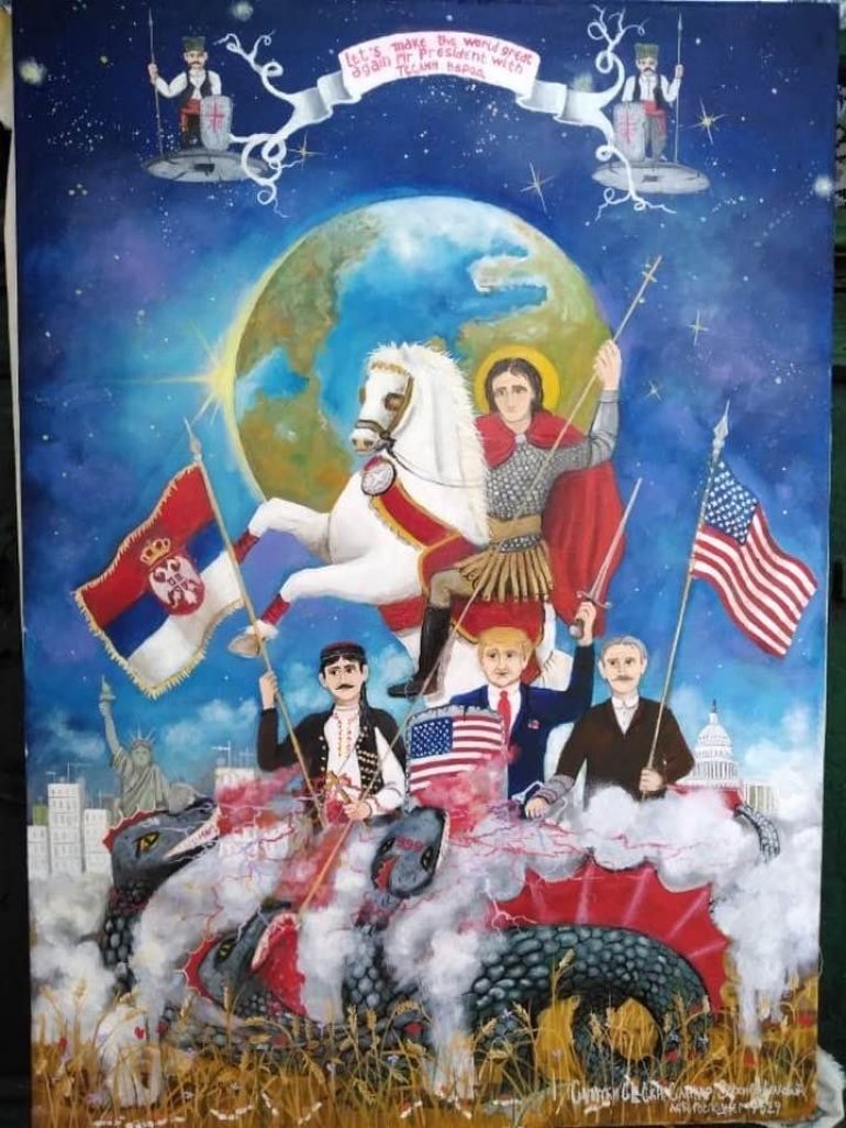 TESLINA naučna fondacija se priprema da Donaldu Trampu pokloni ikonu sa nazivom "Teslin narod". Slikar Zoran Anđelković iz Kruševca naslikao je Svetog Đorđa, Donalda Trampa i Nikolu Teslu u ličkoj i u američkoj nošnji.