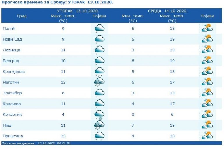 Vetar će biti umeren i jak, zapadni i severozapadni. Najniža temperatura od 7 do 13 C, najviša od 10 do 16 C, saopštio Republički hidrometerološki zavod.