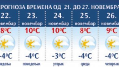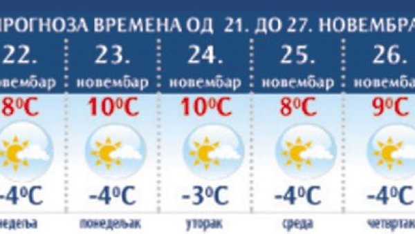 Od ponedeljka, jutra hladna, ponegde slab mraz i magla. U toku dana umereno oblačno i suvo. Temperatura oko proseka za drugu polovinu novembra.