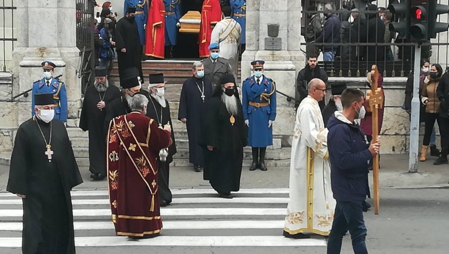 KOVČEG s telom preminulog srpskog patrijarha Irineja iznet je oko 11.15 iz Saborne crkve u Beogradu, odakle će biti prebačen u Hram Svetog Save na Vračaru.