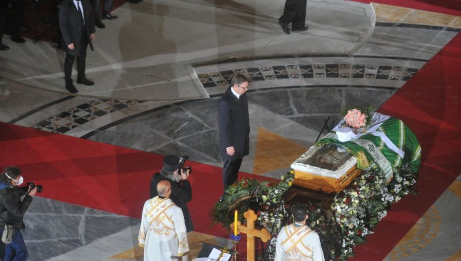 Nakon položenog venca, predsednik Srbije Aleksandar Vučić je ispred kovčega patrijarha Irineja skinuo masku, oči su mu bile pune suza, brada stegnuta... Prekstio se, naklonio i otišao na svoje mesto.