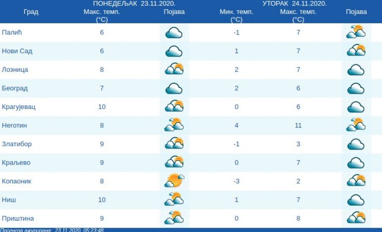 Vetar će biti slab, promenljivog smera, a krajem dana slab i umeren, severozapadni. Jutarnja temperatura kretaće se od minus četiri do jedan, a najviša dnevna od šest do 11 stepeni Celzijusa.