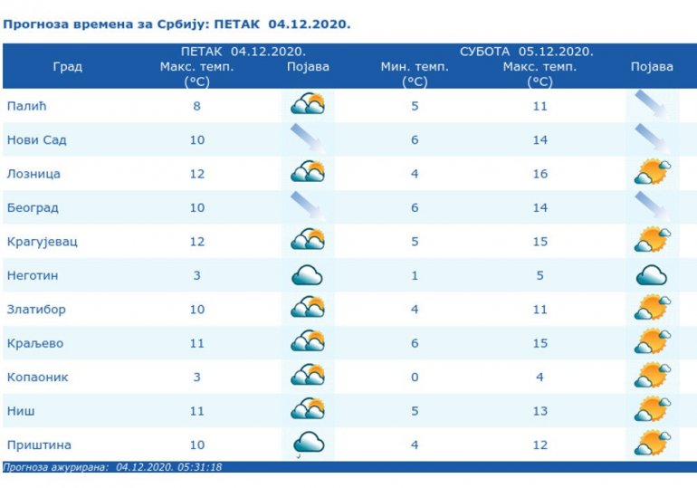 Ujutro i pre podne umereno do potpuno oblačno, a od sredine dana više sunčanih intervala, samo će se na istoku i jugoistoku Srbije zadržati oblačno, ponegde sa slabom kišom.