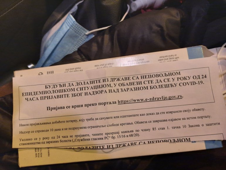 U upozorenju, gde je navedena i mogućnost prekršajne kazne, doslovno se navodi " budući da dolazite iz države sa nepovoljnom epidemiološkom situacijom, u obavezi ste da se u roku od 24 časa prijavite zbog nadzora nad zaraznom bolešću Kovid 19.