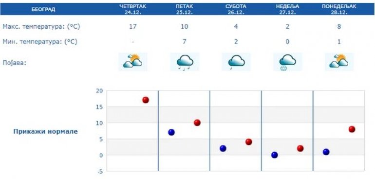 Tokom većeg dela dana biće malo ili umereno oblačno, suvo i toplo. Duvaće samo slab vetar, jedino na sveru i na planinama umeren južni. Međutim, posle podne i uveče na severu zemlje se očekuje naoblačenje, mestimično i sa kišom koja će se tokom noći proširiti na zapadne i centralne krajeve Srbije.