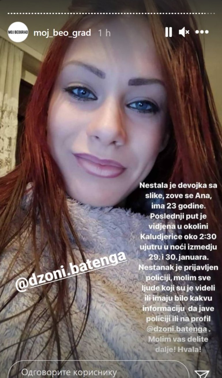 ANA (23) iz Beograda nestala je u noći između 29. i 30. januara. Ona je poslednji put viđena u okolini Kaluđerice oko 2:30 sati.