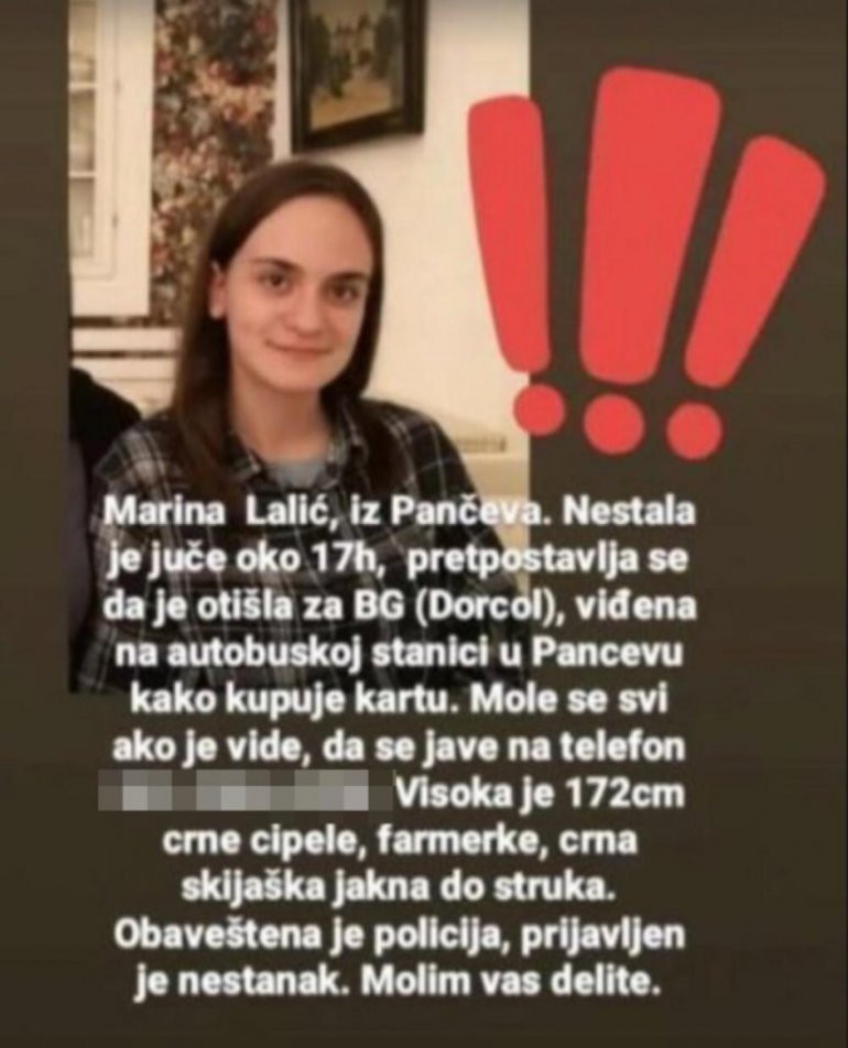 Kako se navodi Marina je nestala juče oko 17 sati, a pretpostavlja se da je otišla za Beograd, tačnije Dorćol.