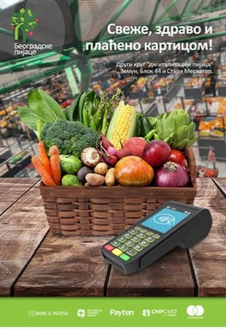 U PRVOJ polovini maja počeće drugi krug Pilot projekta „Digitalizacija pijaca“. Mogućnost bezgotovinskog plaćanja biće uvedena i na pijacama „Stari Merkator“, „Zemun“ i „Blok 44“, tako da će posetioci ovih pijaca robu kupljenu na pijačnim tezgama moći da plate brže i lakše, platnim karticama i mobilnim telefonom, bez prethodne posete bankomatu.