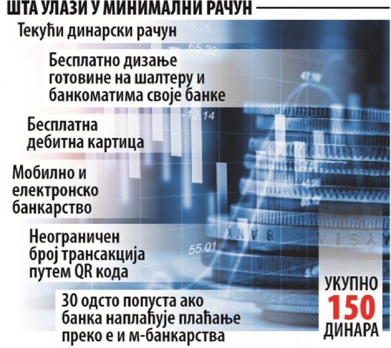 - Uvodimo novinu u regionu, obaveznu minimalnu uslugu po garantovanoj ceni - najavila je juče guverner Jorgovanka Tabaković. - Za 150 dinara mesečnog održavanja građani će imati osnovni dinarski tekući račun, besplatno podizanje gotovine sa šaltera i bankomata svoje banke, kao i besplatnu debitnu karticu. U okviru paketa biće i mobilno i elektronsko bankarstvo i neograničen broj transakcija QR kodom na prodajnim mestima.