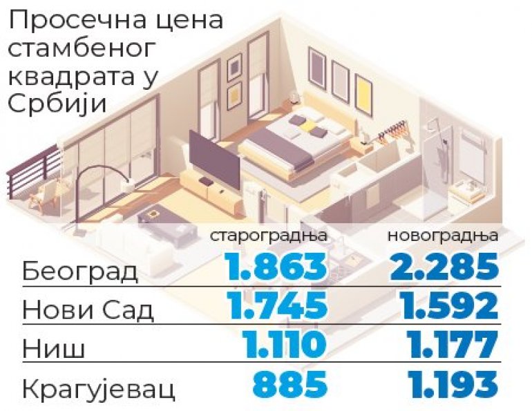 Prema poslednjim podacima Republičkog geodetskog zavoda, prosečna cena kvadrata novogradnje u Beogradu je dostigla 2.285 evra, što je za 10 odsto skuplje nego lane, za 24 nego pre dve godine, a više od 40 procenata u odnosu na 2019. godinu. Gotovo 700 evra skuplji je stambeni prostor po svakom kvadratu. Tako će nekog ko je odlagao rešavanje stambenog pitanja, recimo, isti stan od 50 kvadrata sada koštati za oko 35.000 više nego pre samo tri godine.