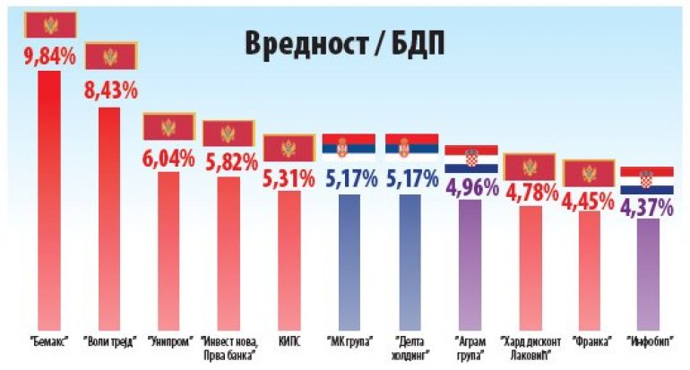 Spisak sada "preseca" srpski dvojac Kostić-Mišković koji sa po 5,17 procenata učestvuju u srpskom BDP i Hrvat Grgić (4,96 odsto). I onda ponovo dvojica Crnogoraca: Komnen Laković ("Hard diskont" - 4,78 odsto) i porodica Franka (Meso promet Franka - 4,45 procenata). Kada se saberu ovi udeli u Crnoj Gori, nabrojana sedmorka ima 44,67 odsto ukupnog BDP ekološke države ili jednostavno rečeno - ogromnu moć!