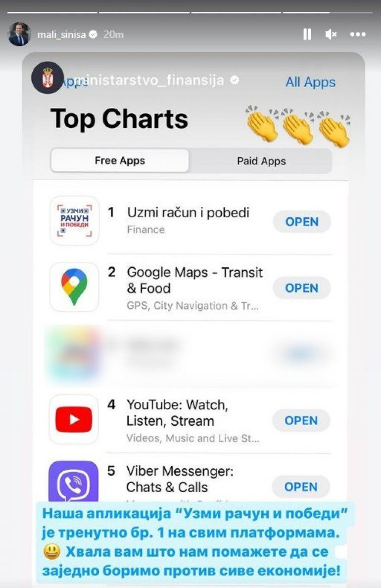 - Naša aplikacija "Uzmi račun i pobedi" je trenutno br. 1 na svim platformama. Hvala vam što nam pomažete da se zajedno borimo protiv sive ekonomije - napisao je ministar.