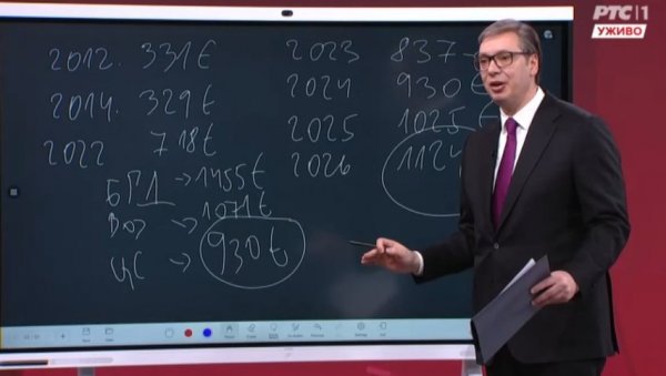 - 2024. godine prosečna plata u Srbiji biti 930 evra, 2025. će biti 1025 evra, 1124 evra krajem 2025. godine. Beograd će imati 1455 evra, a Vojvodina 1071. Važno je da promenimo da u Vojvodini bude više. Nama cela centralna Srbija će biti 930 evra. Zato moramo mnogo da ulažemo u sve... U Radan planinu, Caričin grad... - rekao je Vučić.
