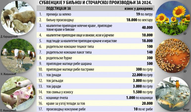 Subvencije za ovce i koze su ove godine povećane sa 7.000 na 10.000 dinara, davanja po košnici sa 800 na 1.000 dinara, dok će živinari koji uzgajaju kokoške lakog tipa umesto 100 dobiti 140 dinara. Za tov junadi povećana su davanja sa 15.000 na 22.000 dinara, tov svinja sa 1.000 na 1.500 dinara, a za tov jagnjadi i jaradi sa 2.000 na 3.000 dinara.