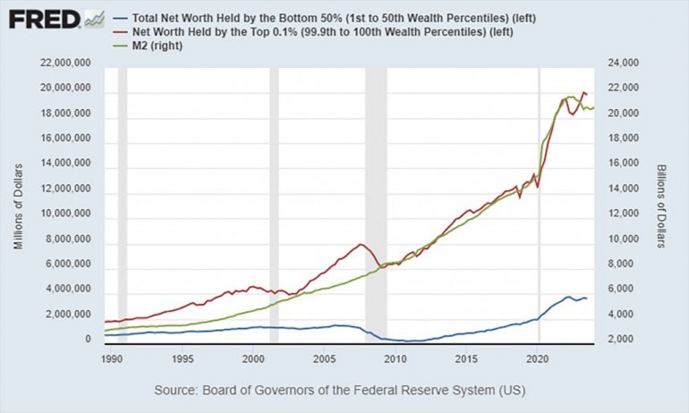 Plava linija pokazuje ukupnu neto vrednost koja je u proteklih desetak godina, od poslednje ekonomske krize dostigla nivo niži od šest biliona dolara, koji drži 50 odsto stanovništva SAD, dok crvena linija pokazuje koliko je pripalo najmoćnijima. Čak 22 biliona dolara, "prigrlilo" je 0,1 odsto bogataša.