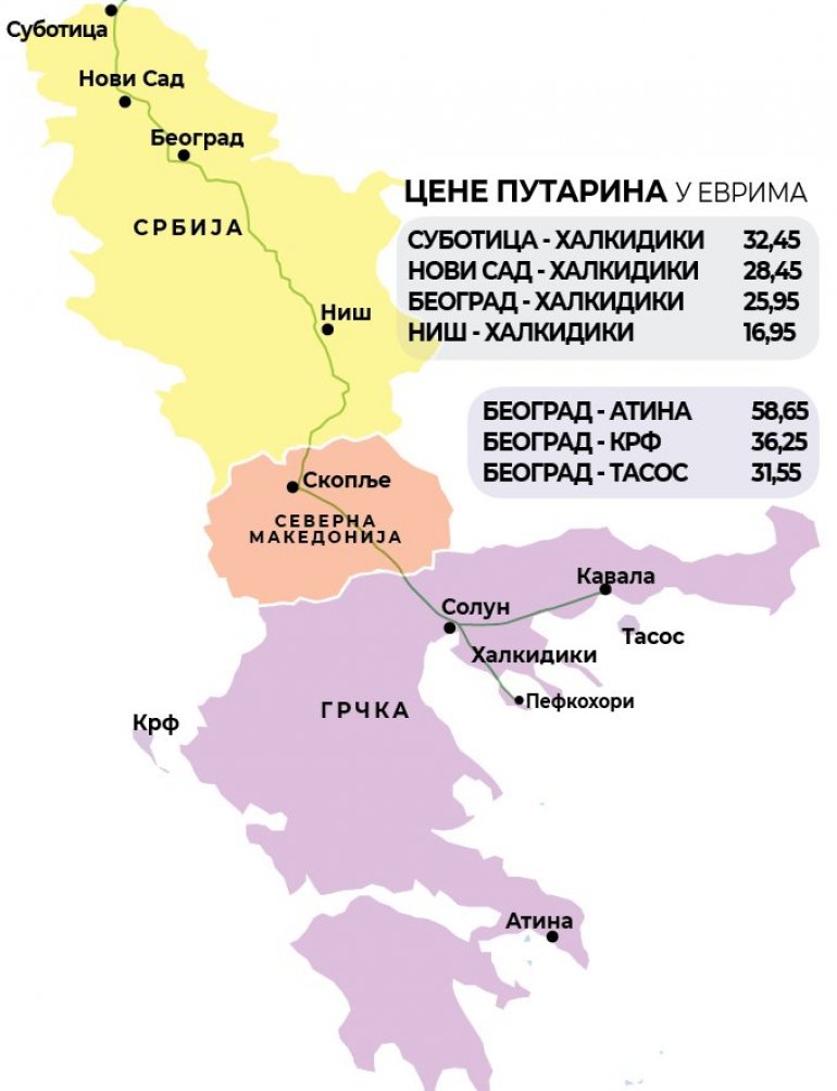 Putnici koji iz Beograda idu na Krf, do Igumenice će platiti 36,25 evra, odnosno oko 4.250 dinara, a ukoliko letuju na Tasosu, putarina do Kavale će ih koštati 31,55 evra ili oko 3.700 dinara. Od Beograda do Atine potrebno je izdvojiti 58,65 evra, što je 6.870 dinara.
