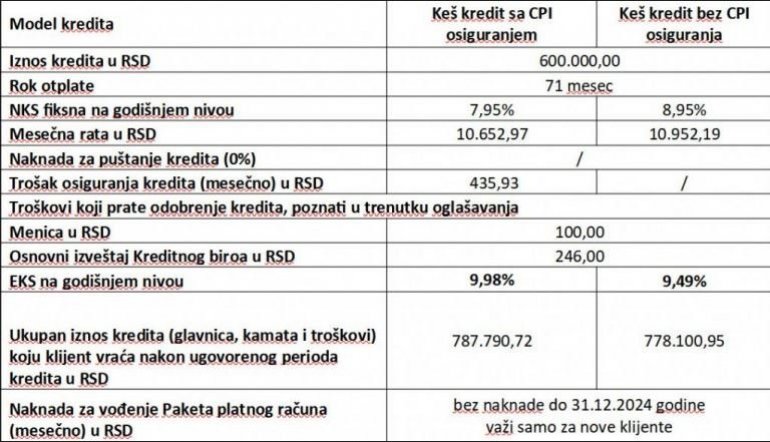 Reprezentativni primer dat je za model keš kredita sa fiksnom kamatnom stopom i CPI osiguranjem na dan 04.09.2024. godine, koji važi samo za nove klijente u stalnom radnom odnosu u javnom sektoru (Javna preduzeća, Zdravstvo, Vojska, MUP, Prosveta) a koji će, uz otvaranje Gold Paketa platnog računa preneti svoju zaradu u UniCredit Banku .