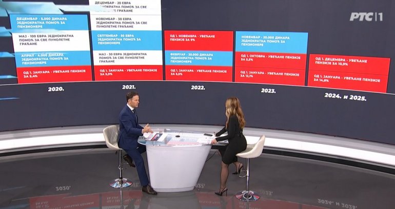 - Lep trenutak je za naše penzionere danas. Kao što je predsednik Vučić obećao na današnji dan isplatićemo svim penzionerima, odnosno svi bi trebalo da dobiju na današnji dan jer plaćamo već nekoliko dana unazad. Dakle uvećane penzije za 10,9 odsto. To su penzije koje su uvećane od prvog decembra prošle godine. Dakle još jedno obećanje je ispunjeno dakle. Ovo je još jedno dvocifreno povećanje penzija. I prosečna penzija sa ovim povećanjem je 436 evra u Srbiji. To je duplo više nego 2012. kada je bila 202 evra i na dobrom smo putu da do decembra 2027. bude 650 evra - rekao je Mali na poččetku gostovanja.