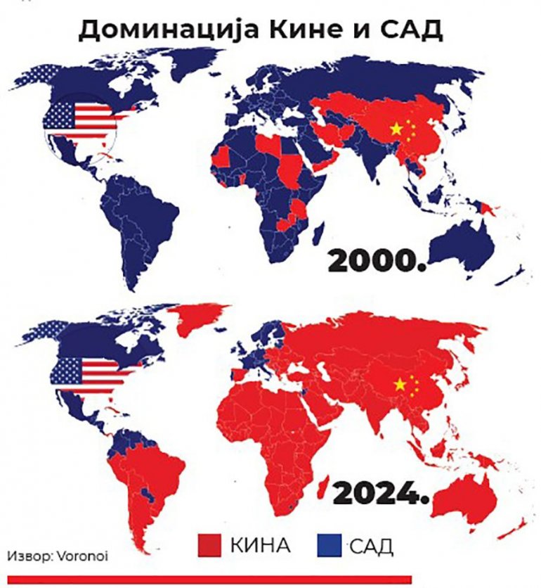 KINA je sada dominantni trgovinski partner za većinu Azije, Istočne Evrope, Bliskog istoka, Okeanije, Južne Amerike i Afrike. Stručnjaci očekuju da će ubuduće SAD najverovatnije ojačati trgovinske veze sa Evropom, bez Rusije, severnom Afrikom i Indijom, dok će Kina produbiti svoje kontakte sa tržištima u razvoju - uvozeći goriva, minerale i poljoprivrednu robu uz izvoz industrijskih proizvoda.