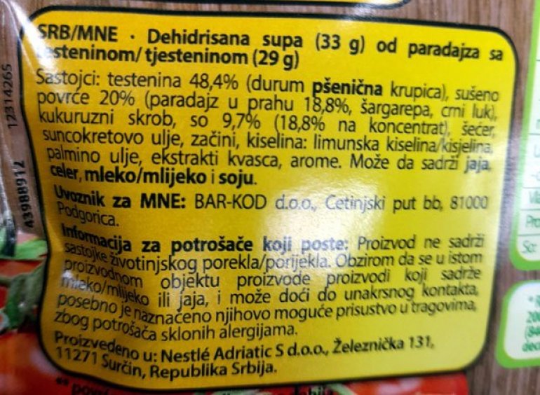 U kompaniji "Nestle", koja u svom asortimanu ima i posne proizvode, poput supa, kažu da kao odgovoran proizvođač prate i poštuju regulativu u ovoj oblasti, odnosno sve odredbe Pravilnika o navođenju dobrovoljnih informacija o hrani i preduzimaju sve mere predostrožnosti u skladu sa dobrom proizvođačkom i higijenskom praksom.