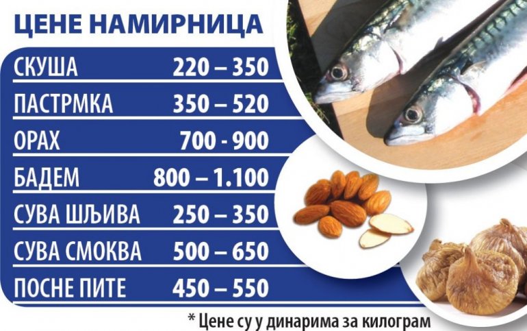 NA posnoj trpezi su obavezni jezgrasto i sušeno voće, koje je prilično skupo. U svakom slučaju cene ovih namirnica su znatno povoljnije kada se pazare u rinfuzu na pijaci ili u prodavnicama koje su poznate pod nazivom "zdrava hrana". Za kilogram tako kupljenog badema, lešnika i oraha treba izdvojiti od 700 do 1.100 dinara. Suve šljive su od 250 do 350 dinara, smokve od 500 do 650, a suve kajsije idu i do 800 dinara. Svi ovi proizvodi su znatno skuplji, ako se pazare upakovani u marketima.