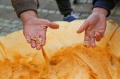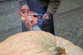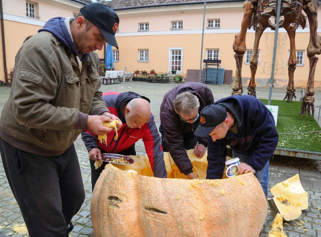 TESTEROM I SEKIROM SEČENE NAJVEĆE TIKVE: Džinovske bundeve sa manifestacije “Dani ludaje” u Kikindi rasečene radi semena (FOTO)