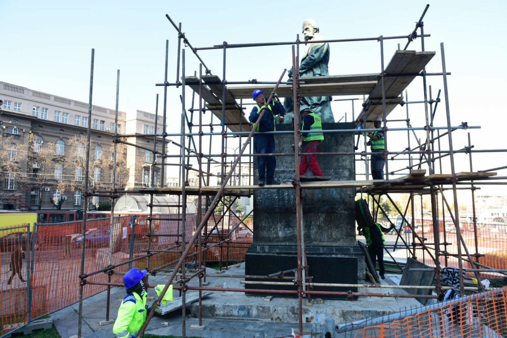SKELE OPKOLILE VUKA: Majstori skidaju ploče sa postamenta spomenika reformatora Srpskog jezika na uglu Bulevara i Ruzveltove