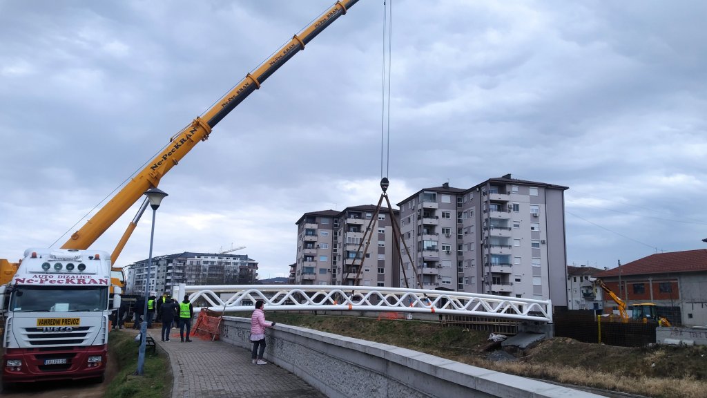 KRAN SPUSTIO ČELIČNU GRDOSIJU: U Paraćinu danas montiran prvi od četiri pešačka mosta (FOTO/VIDEO)