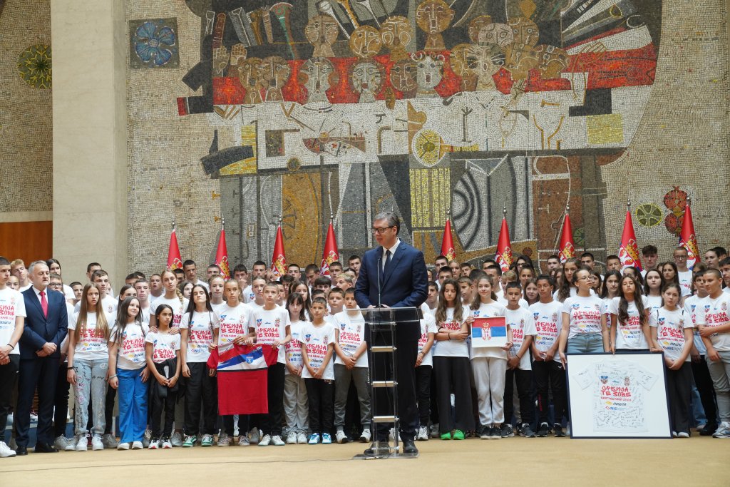 DRES I ZASTAVA ZA PREDSEDNIKA: Učesnici kampa "Srbija te zove 2023" uručili poklone Vučiću (FOTO)