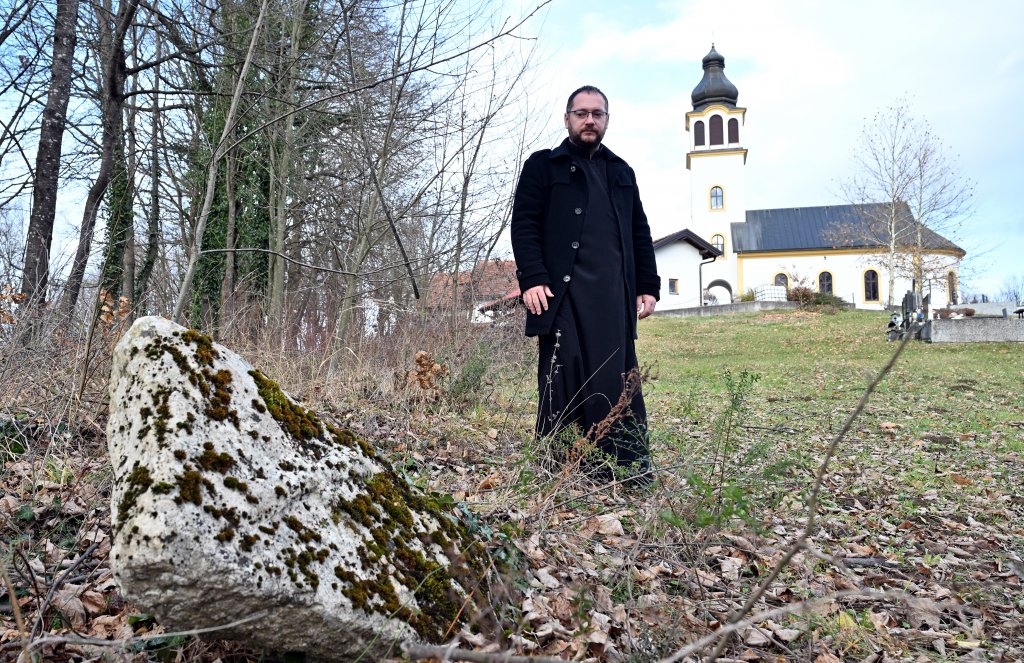Sveštenoslužitelj Željko Božić kraj drevnog stećka