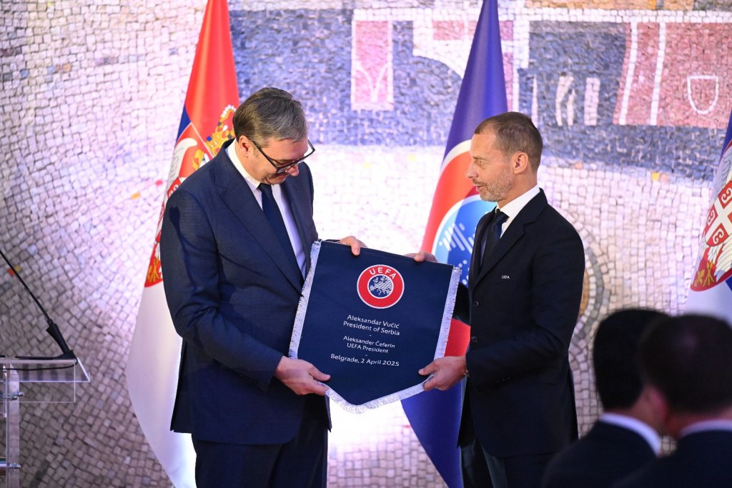 VUČIĆ SA LEGENDARNIM LUISOM FIGOM: Pogledajte susret - srpski predsednik dobio specijalni poklon od vlasnika PSG-a (FOTO/VIDEO)