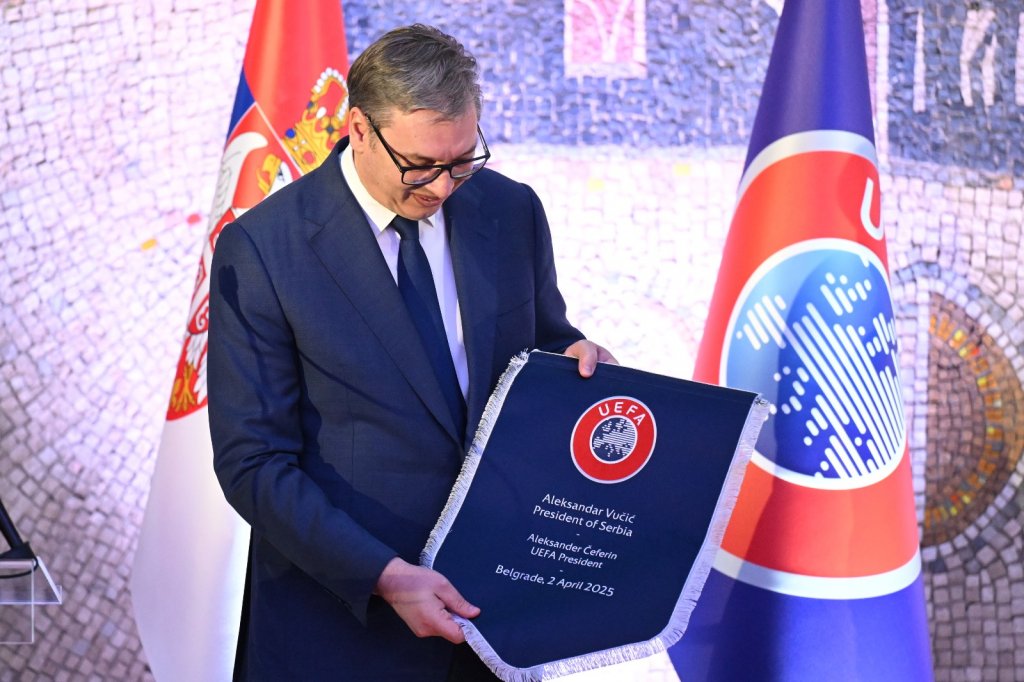 VUČIĆ SA LEGENDARNIM LUISOM FIGOM: Pogledajte susret - srpski predsednik dobio specijalni poklon od vlasnika PSG-a (FOTO/VIDEO)