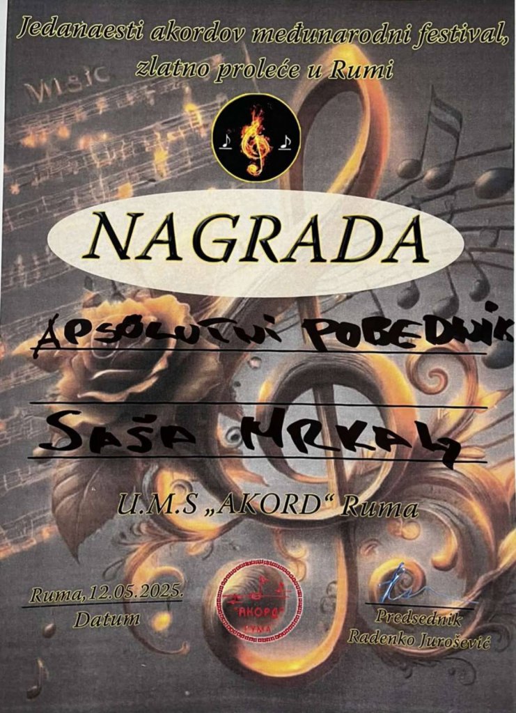 SAŠA MRKALj OPET ZABLISTAO: Apsolutni pobednik festivala "Zlatno proleće u Rumi" (FOTO)